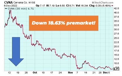 Carvana is down 18.63% premarket after company creditors led by Apollo Global Management and Pacific Investment Management Co. signed an agreement to talk credit with the company. The move is intended to avoid conflicts over debt restructuring. Firms holding 70% or about $4 billion of Carvana’s unsecured debt have signed the agreement.