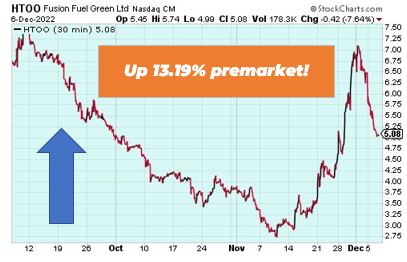 Fusion Fuel Green is up 13.19% premarket after announcing today that the company has been approved for a $36 million grant for its ‘Sines Green Hydrogen Valley Alliance’ through component 5 of Portugal’s Recovery and Resilience Plan. The component is intended to align stakeholders to develop a domestic green hydrogen ecosystem.