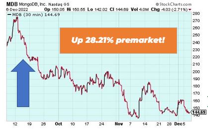 MongoDB, Inc. is up 28.21% premarket after reporting earnings of $0.23 versus expected losses of $0.17. The software company’s revenue came in at $333.6 million versus $305.09 million. Its results were highlighted by 61% revenue growth and $20 million of non-GAAP operating income. CEO Dev Ittycheria cited ‘continued strength in new business activity and improved Atlas consumption trends’ as primary reasons for the spike.