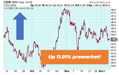 Ciena is up 11.01% premarket after reporting strong earnings for the fourth quarter. The software company reported revenue for the fiscal year came in at $3.63 billion, as compared to $3.62 billion for fiscal year 2021. Gary Smith, CEO of Ciena, cited ‘favorable supply chain developments’ in the second quarter as the reason for the strong quarter.
