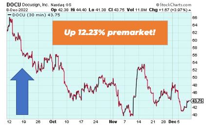 Docusign is up 12.23% premarket after the e-signature company beat expectations with its latest financial results. Quarterly earnings came in at $0.57 per share, beating the Zacks Consensus Estimate of $0.41 per share. Overall, the company surprised in earnings by 39.02%.