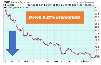 Carvana Co. is down 9.27% premarket as the used car seller is fighting for survival. It’s currently running out of cash, with a $1.45 billion net loss for the nine-months that ended Sept. 30. A challenging restructuring process is likely the next step.