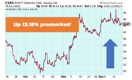 Exact Sciences Pharmaceuticals is up 13.18% premarket after Guardant tanked 40% due to poor results from a study using its blood test to screen for colorectal cancer. Overall, Exact Sciences’ stool-sample test is still the most effective, which was the main reason for the spike.