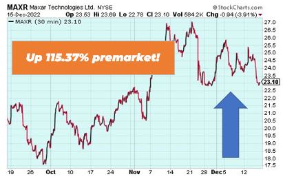 Maxar is up 115.37% premarket after it was announced the private equity company Advent would buy Maxar for about $4 billion. Including debt, the transaction is worth $6.4 billion. Advent will pay $53 a share for Maxar.