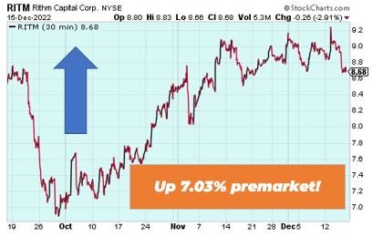 Rithm Capital Corp. is up 7.03% premarket after the software company announced its Board of Directors has declared fourth quarter 2022 common and preferred stock dividends. The board declared a quarterly dividend of $0.25 per share of common stock for the fourth quarter of 2022. The dividend is payable on January 27, 2023.