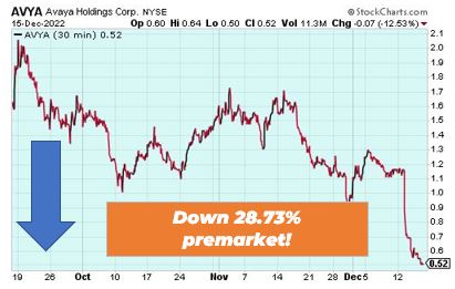 Avaya is down 28.73% premarket after approaching chapter 11 bankruptcy filing. The company had said there was substantial doubt about its ability to continue due to debt maturity concerns. As of now, it said it has been in talks with other financial stakeholders regarding a comprehensive resolution to its balance sheet.
