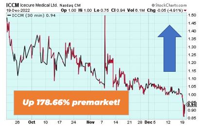 IceCure Medical is up $178.66% premarket as the Israel-based medical device maker announced successful studies pertaining to its kidney tumor treatment at a Urological Association conference in Israel. The stock was up as much as 1,000% before pulling back. Its device is called Prosense, a minimally invasive medical device that seeks to destroy tumors by freezing them in a process called cryoblation.