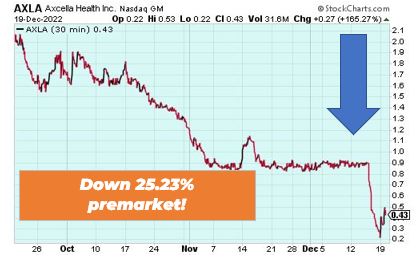Axcella Health is down 25.23% premarket after the company put development of its NASH program aside and reduced its workforce by 85%. The company also announced its reprioritizing its programs for Long COVID Fatigue and a restructuring of operations.