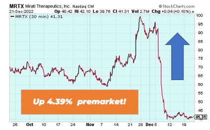 Mirati Therpeutics is up 10.68% premarket after receiving breakthrough therapy designation from the FDA for patients with advanced colorectal cancer. The designation is supported by results from a Phase 11b cohort of the KRYSTAL-1 trial. The FDA will now grant to expedite the development and regulatory review of the drug.