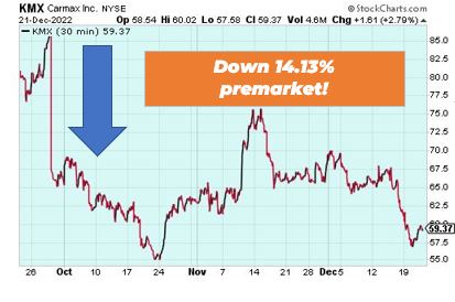 CarMax is down 14.13% premarket after a big earnings miss. The company cited ‘vehicle affordability challenges’ due to inflation and rising interest rates. Net income from the quarter to Nov. 30 fell to $37.6 million, or 24 cents a share, from $269.4 million, or $1.63 a share, in the year-ago period.