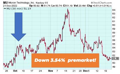 Micron Technology is down 3.54% premarket. The chipmaker announced it will cut 10% of its workforce as demand for computer chips slumps. It expects sales could dive more than 50% and more belt-tightening is expected before outlook improves. The move caused other stocks like Nvidia and AMD to slip as well.