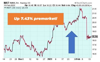 Mattel is up 7.43% premarket after the company announced its relaunching the popular cartoon dinosaur Barney for a reboot. The reimagined Barney will appear in film, television and other content, including a new animated series to come out in 2024.
