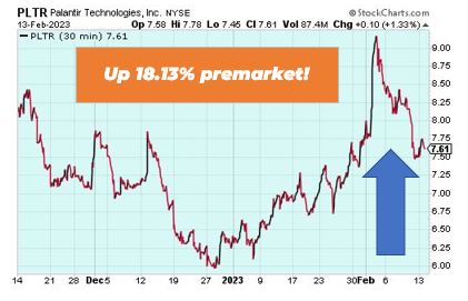 Palantir Technologies is up 18.13% premarket after announcing it was profitable for the first time after looking at earnings from the last quarter. The data analysis company expects 2023 to be its first-ever profitable year. Its stock was helped along by higher-than-anticipated revenue, fueled by growth in sales to governments, and lower costs related to stock compensation.