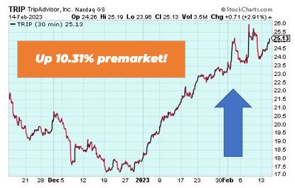 Trip Advisor is up 10.31% premarket after the company posted revenue of $354 million in the fourth quarter, which was higher than Wall Street’s expectations of $343.7 million. The report represents an earnings surprise of 220%.