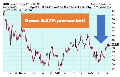Devon Energy is down 6.47% premarket after the company announced it sees 2023 capital expenditure reaching $3.6 billion to $3.8 billion. Wall Street was expecting $3.42 billion. The energy company’s fourth quarter core earnings per share of $1.66 came in below expectations of $1.76.