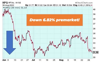 HP Inc. is down 6.82% premarket as the computing giant missed earnings estimates. The company said fiscal third-quarter sales fell 4.1% from a year ago, pushed lower by a 32% decline in notebook computer units sold. The company also fell short of estimates for total sales, posting $14.7 billion vs. $15.6 billion in revenue.