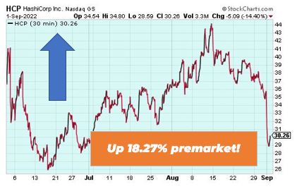 HashiCorp is up 18.27% premarket after the leading provider of multi-cloud infrastructure automation announced financial results for its second quarter of fiscal 2023, ended July 31, 2022. Total revenue was $113.9 million, up 52% from $75.1 million in the same period last year. Gross profit came in at $92.3 million, representing an 81% gross margin.