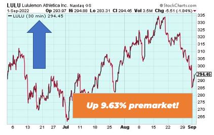 Luluemon Athletica is up 9.63% premarket after the casual and sports apparel group posted strong third quarter earnings and boosted its full-year profit forecast. The Vancouver-based retailer earned an adjusted $2.20 per share on sales of $1.87 billion for three months ending in July. This is the ninth consecutive quarter Luluemon beat Wall Street expectations.