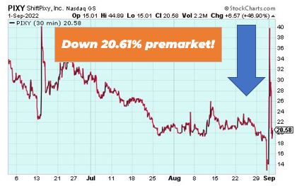 ShiftPixy is down 20.61% premarket after the announced it will put a one-for-one hundred (1:100) reverse split of the company’s issued shares of Common Stock. The reversed shares began trading yesterday.