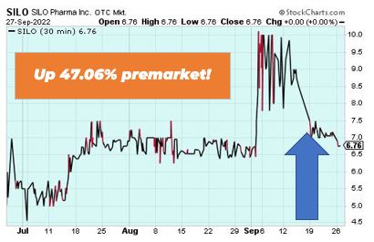 Silo Pharma is up 47.06% premarket after announcing pricing of an underwritten public offering of 1,000,000 shares of its common stock at a price to the public of $5 a share. The gross proceeds to Silo Pharma from this offering are expected to be $5,000,000 before expenses.