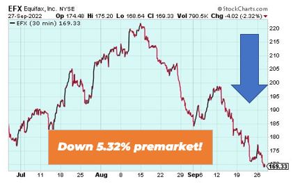 Equifax is down 5.32% premarket after a small rival urged the U.S. Federal Trade Commission should investigate how Equifax amassed payroll records about most Americans. Equifax has been acquiring employee compensation data for decades, but these big databases are vulnerable to theft and error. Workers are also sometimes surprised their records are included, according to privacy activists.