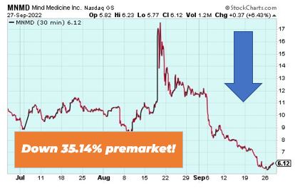 Mind Medicine is down 35.14% premarket after the biopharmaceutical company announced a proposed public offering of common shares. Shares sank after a Bloomberg report that shares will be offered at $4.25 each.