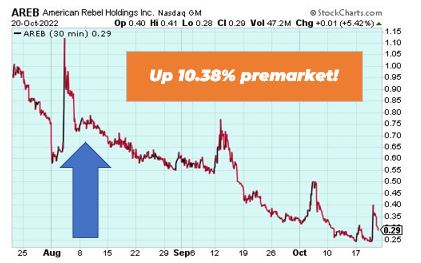 American Rebel Holdings is up 10.38% premarket after announcing it anticipates reporting approximately $5 million in pro forma Q3 gross revenue and approximately $14.7 million in pro forma revenue over the last nine months. The company expects to file with the Securities and Exchange Commission on or before November 14, 2022.