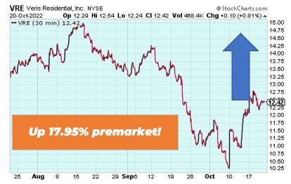 Veris Residential is up 17.95% premarket after the real estate investment trust confirmed an unsolicited proposal by Kushner Companies to acquire or externally manage the company for $16.00 per share. Veris Residential’s Board of Directors is currently evaluating the proposal.
