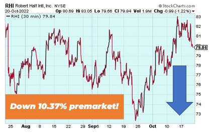 Robert Half International is down 10.37% premarket after missing third-quarter earnings estimates. The company delivered earnings surprises of -7.27% and 3.99%, respectively. Over the last four quarters, the company has surpassed consensus EPS estimates two times.