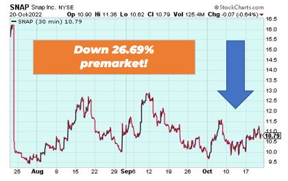 SNAP is down 26.69% premarket after its latest quarterly earnings report. Advertising slowdown and Apple privacy changes were among the culprits for a fifth straight quarterly deceleration. Average revenue per user came in at $3.11 vs. $3.17 estimate. SNAP’s crash also dragged down Meta, Google and Pinterest as those stocks are also exposed to the online ad market.