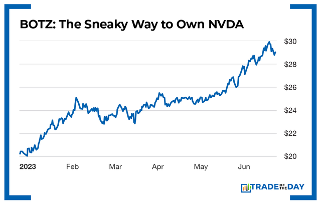 A secret, backdoor way to own NVDA is through the Global X Robotics & Artificial Intelligence ETF (BOTZ).