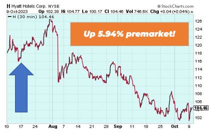 Hyatt Hotels is up 5.94% premarket after announcing its set to join S&P Midcap 400 prior to the opening of trading on Thursday. S&P Dow Jones Indices is the largest global resource for essential index-based concepts. The change will become effective on Oct. 12, 2023.