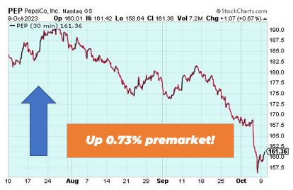 PepsiCO is up 0.73% premarket after another round of price increases allowed the drinks and snacks giant to lift its full year profit forecast for a third straight quarter. PepsiCo said earnings for the three months in September came in at $2.25 per share, up 14.2% from the same period last year and well ahead of Wall Street consensus of $2.15 a share.