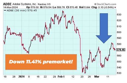 Adobe is down 11.41% in premarket due to its fourth-quarter earnings report and future guidance falling short of market expectations. The company reported provided weaker-than-expected full-year revenue guidance. Adding to the concerns was the disclosure of regulatory scrutiny by the Federal Trade Commission (FTC) since June 2022, investigating Adobe’s subscription models, particularly its disclosure and subscription cancellation practices. This investigation could lead to significant monetary costs or penalties, impacting Adobe’s financial results and operations.