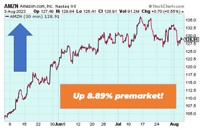 Amazon is up 8.89% premarket after the mega cap’s latest gains powered S&P 500 futures higher. The company’s boost came after reporting quarterly earnings that were nearly double what analysts expected. Operating income more than doubled to $7.68 billion over the three months ending in June, which smashed the Wall Street forecast of $4.42 billion, as margins improved to 5.7% and revenues rose 11% from last year.