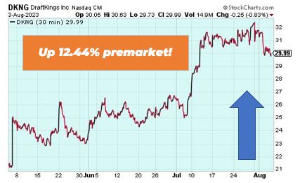 DraftKings is up 12.44% premarket after the daily fantasy sports betting site posted strong earnings for the second quarter and boosted its full-year revenue outlook. Revenue surged 88% to $875 million as it continues to benefit from more states around the country allowing legalized gambling.