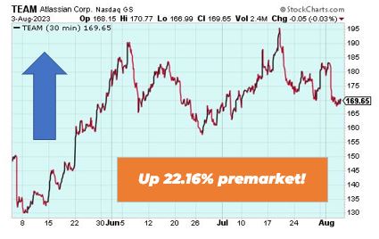Atlassian is up 22.16% premarket after its cloud revenue forecast jumped. Its expected cloud revenue will grow in the fiscal year ending June 2024 by 25% to 30%, according to the software company. The shares jumped to a high of $213.70 in extended trading after closing at $169.65 in New York.