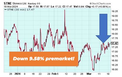 StoneCo Ltd is down 9.58% premarket despite a rise in Q4 earnings and revenue. However, the company subsequently announced changes to its board, with Founder Andre Street deciding not to seek re-election at the upcoming Annual General Meeting, which will take hold by the end of April. Vice chairman Conrado Engel not seeking re-election.