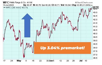 Wells Fargo is up 3.04% premarket after its profits surged 57% on higher interest income from customers. Its net interest income climbed 29% to $13.16 billion as banks raised their borrowing costs following a series of rate hikes by the Federal Reserve to tame inflation.