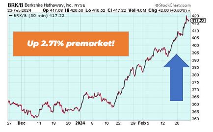 Berkshire Hathaway is up 2.71% in premarket after Warren Buffett’s company posted a record $37.4 billion operating profit and $96.2 billion net profit for all of 2023. The earnings update put the conglomerate on course for a market value closer to $1 trillion.