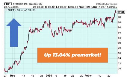 Freshpet is up 13.04% in premarket after its net sales increased by 29.9% in Q4 and 28.8% for the full year 2023. It posted 34.6% of net sales in Q4, reflecting better plant expense leverage and reduced quality costs.