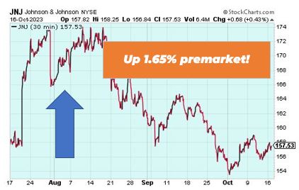 Johnson & Johnson is up 1.65% premarket. The company posted stronger-than-expected third quarter earnings on Tuesday, while boosting its full-year profit forecast. The gains came from its new cancer treatments. Overall, operational sales are expected between $83.6 billion and $84 billion.
