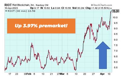 Riot Platforms is up 3.97% premarket and was up as high as 15% in after hours trading. Other crypto stocks such as Coinbase (COIN) was also up in after hours trading. There was no obvious reason for the boost, other than the fact that Bitcoin (BTC) traded 3.8% higher yesterday afternoon and. Also, rising interest rates crushed Bitcoin in 2022, and with the Federal Reserve’s interest rate hikes slowing down as of late, which has been historically good for riskier assets like Bitcoin.