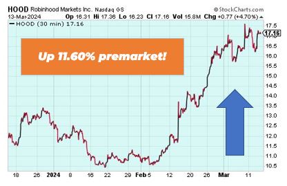 Robinhood is up 11.60% in premarket after a significant increase in trading volumes reported for February. The company noted an increase in funded customers to 23.6 million and a 16% rise in Assets Under Custody to $118.7 billion, with net deposits reaching $3.6 billion for the month. This translates to a substantial annualized growth rate, indicating strong user engagement and financial inflow.
