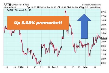 UiPath is up 5.08% premarket after the U.S. Treasury Department announced a reduction in its borrowing estimate for the first quarter of 2024, which has been taken positively by the market. It also reported earnings of $0.22 per share, which beat the Zacks Consensus Estimate of $0.15 per share. The quarterly report represented an earnings surprise of 46.67%.