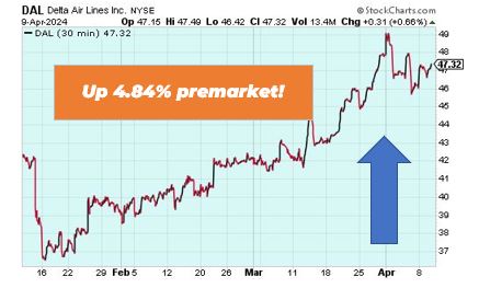 Delta Air Lines is up 4.84% in premarket trading due to a bullish outlook for the second quarter, driven by strong travel demand. The company anticipates an adjusted profit between $2.20 and $2.50 per share, surpassing analyst expectations. Delta aims for a 14% to 15% operating margin and a 5% to 7% increase in second-quarter revenue year-on-year, supported by a forecast of 4.7 billion global travelers in 2024. This outlook underscores Delta’s positive momentum and operational performance, along with robust bookings for international trips and corporate travel.
