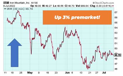 Iron Mountain is up 3% premarket as the company continues to elevate its status as a player in the fast-growing data storage industry. The company has a customer retention rate of 98%, and it was able to grow its AFFO per share to a record $3.48 in 2021. That’s good for 13.4% growth. It also offers a 5% dividend yield. Keep an eye on Iron Mountain going forward.