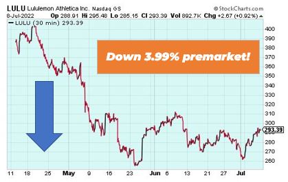 Luluemon Athletica is down 3.99% premarket after Jefferies downgraded the athletics apparel maker to underperform from hold and cut its price to $200 from $375. Analysts said the sector saw a spike in demand from COVID, which could slow growth against difficult comparisons. It is also facing increased competition from companies like Alo, Athleta and Vuori. Luluemon is looking volatile.