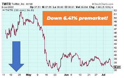 Twitter is down 6.41% premarket after Elon Musk announced he was terminating his deal to buy the social media giant due to several breaches of the merger agreement. Jefferies analyst Brent Thill said he believes Musk’s decision to terminate the deal was based more on the market sell off than any ‘failure’ to comply requests. Twitter is looking volatile.