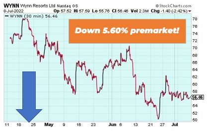 Wynn Resorts is down 5.60% premarket after Macau city officials said casinos there would be shut down for a week to fight a COVID-19 surge. Shares of Las Vegas Sands Corp. also dropped 5.3%. Wynn and Las Vegas Sands had more revenue from Macau than Las Vegas in 2021. Both stocks are looking volatile.